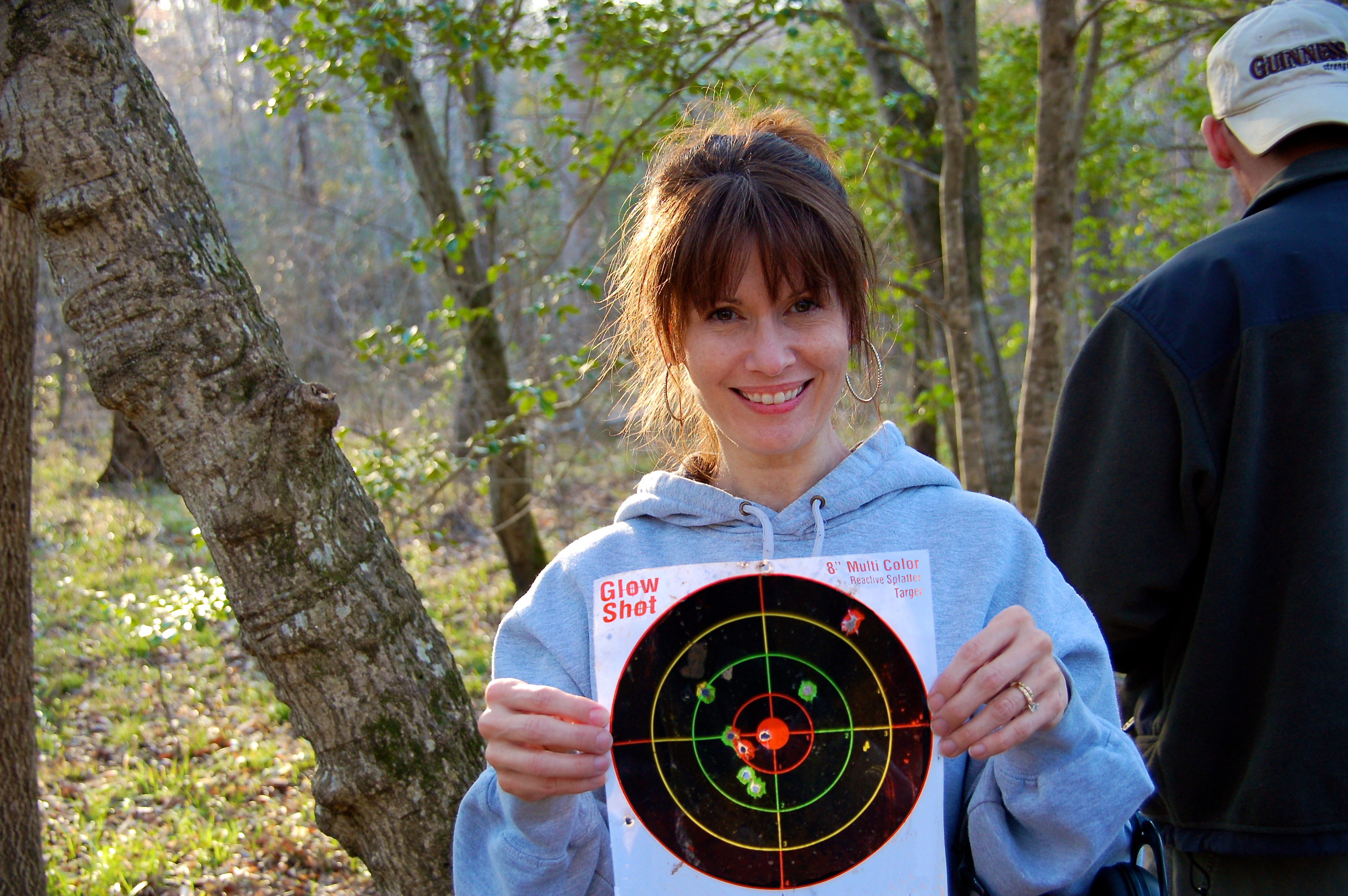Jill, showing off her .357 marksman skills…the bullseye and four shots in the lower left quadrant are hers 🙂