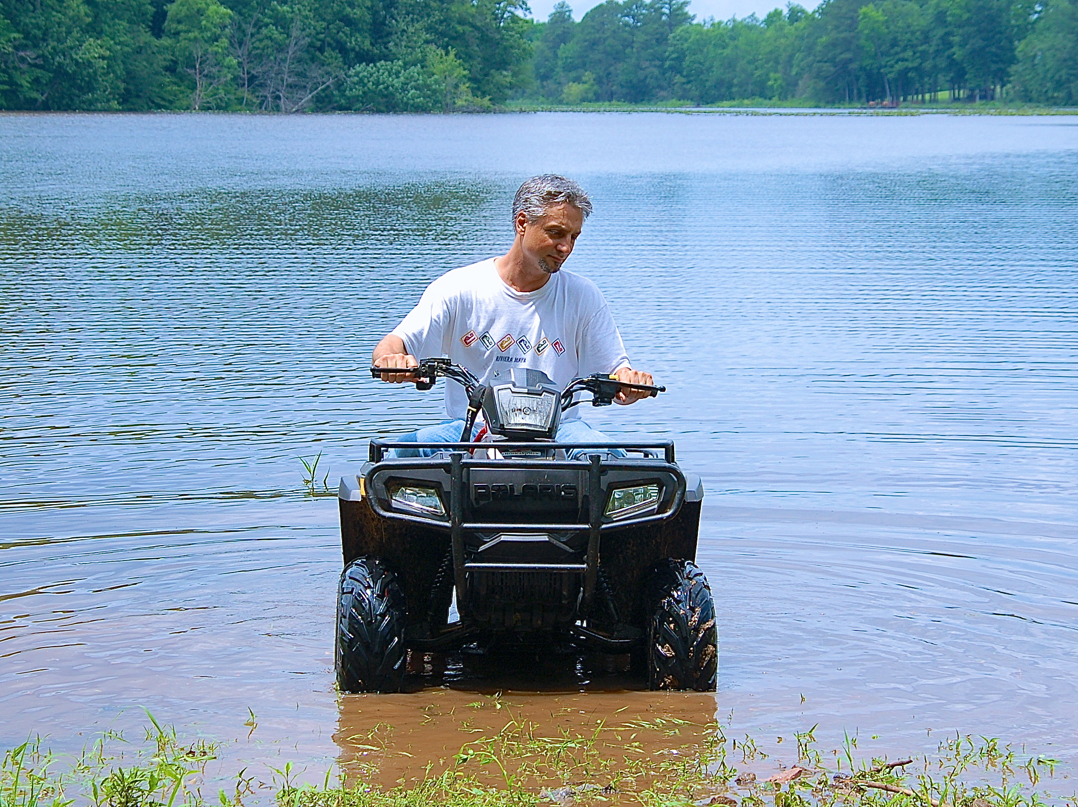 Dave drives the ATVs into the lake to clean them off
