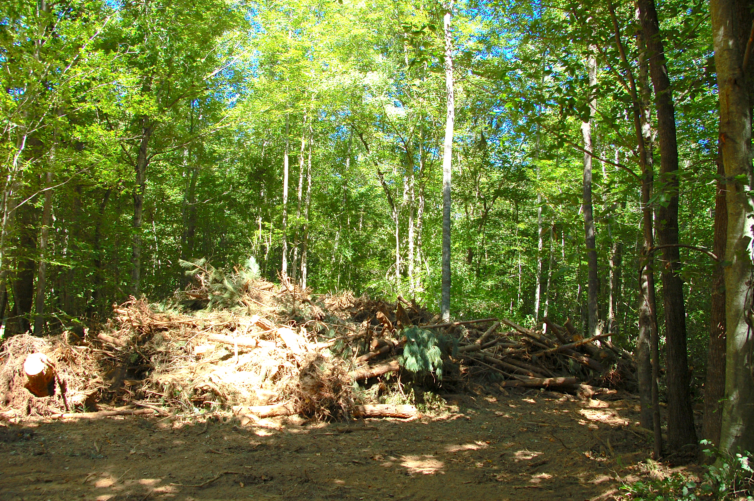 pile of debris from cabin site at the trail entrance