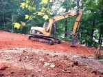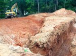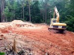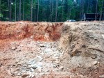 The excavator is resting on the old road with the lake to the right and cabin site to the left. Notice that the shelf that was along the road to the left is now gone. Fortunately George didn’t encounter a huge slab of rock, as we had feared, given that the giant rock bluff that we call Waffles Ridge is just to the left of the cabin site!