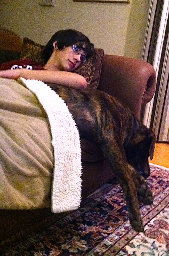 still exhausted once she got home, Waffles snuggles with Max and almost falls off the couch
