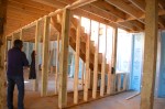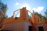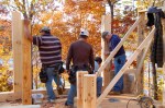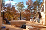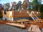 After a great start on Thursday, the progress on Friday was slowed down due to the weather.  As the forecast had called for rain all day, Dave and I opted not to go down, thinking we wouldn’t be missing anything.  However, we were were mistaken. The crew had been able to finish the sub-flooring before the rain started so once the skies opened up, they went below and built the stairwell leading from the first floor to the basement. Fortunately, there were periodic breaks in the rain and they were then able to work up top and prep for the stacking of the logs.  George Lewis returned in the morning, before the rain came, and was able to do the back fill along the foundation so the crew no longer had to use a catwalk to get to the cabin. By the time Dave arrived Saturday morning, they had already stacked three rows!