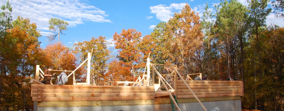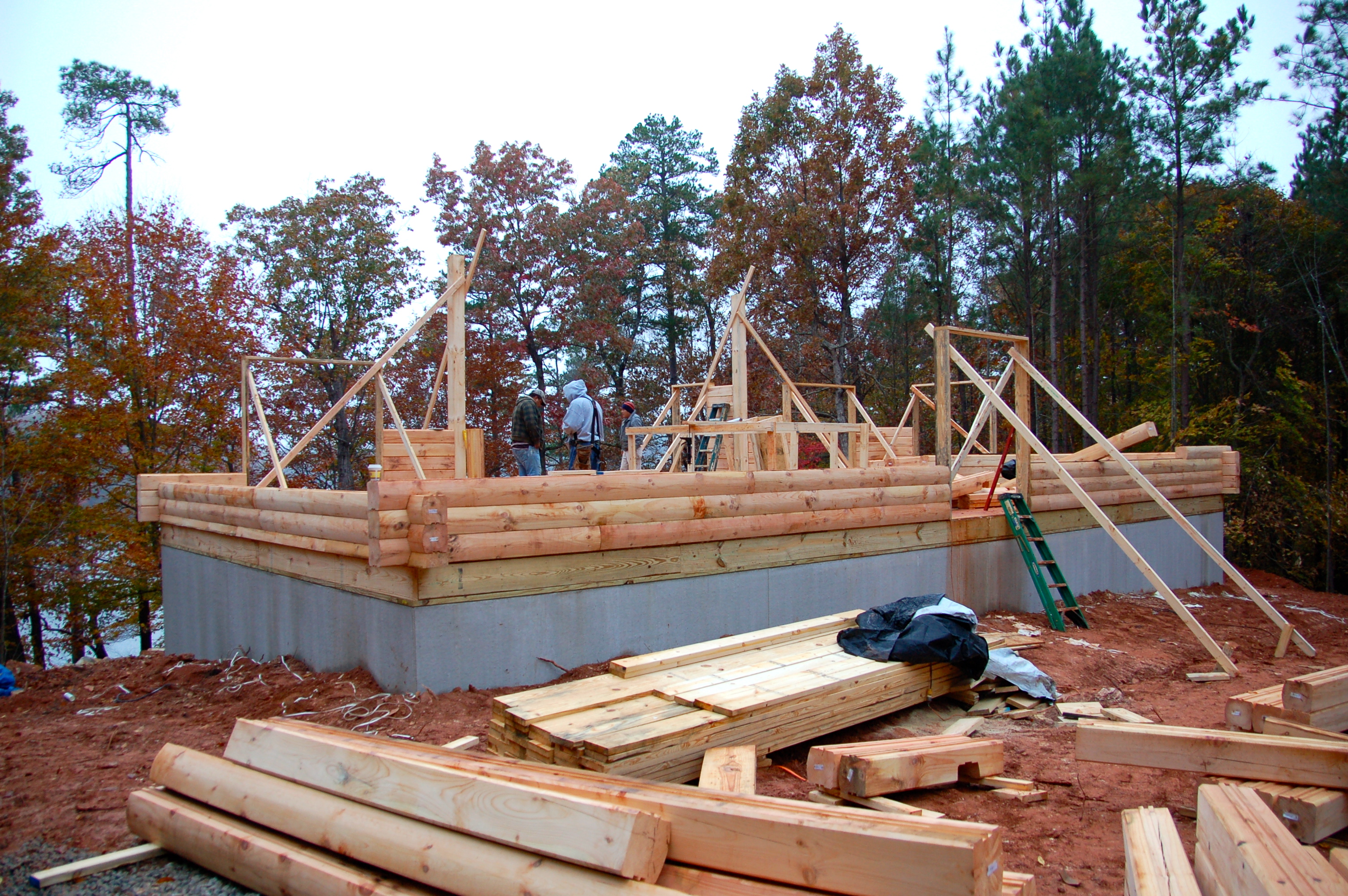 After a great start on Thursday, the progress on Friday was slowed down due to the weather.  As the forecast had called for rain all day, Dave and I opted not to go down, thinking we wouldn’t be missing anything.  However, we were were mistaken. The crew had been able to finish the sub-flooring before the rain started so once the skies opened up, they went below and built the stairwell leading from the first floor to the basement. Fortunately, there were periodic breaks in the rain and they were then able to work up top and prep for the stacking of the logs.  George Lewis returned in the morning, before the rain came, and was able to do the back fill along the foundation so the crew no longer had to use a catwalk to get to the cabin. By the time Dave arrived Saturday morning, they had already stacked three rows!