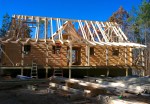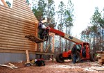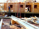 - OSB is placed over the band board to prepare for log siding…low on OSB, the crew cleverly cut up and used the walls of the crate that the windows had arrived in