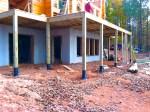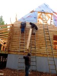 By Sunday, the log siding was ready to be placed. The full timber logs make up the first floor walls as well as the double story wall around the windows in the great room, while the two second story side walls are framed, covered with OSB and then covered with the log siding. Once it is finished and stained, they will look like logs as well. Once the logs and siding are finished, caulking is placed, if desired, in areas where there are slight gaps. While the crew was on lunch break, Dave decided he would pick up a caulking gun and start doing a little caulking himself. Clearly none of the crew members know that Dave has done his share of caulking in the past. I heard a quiet muttering in Spanish behind me as one of the crew members tried to catch Miguel’s attention to let him know what was going on. Next thing we knew, several heads appeared around the corner of the front porch as everyone came to see what was going on. Miguel promptly came over and removed the caulking gun from Dave and proceeded to do it himself. Lunch break over!