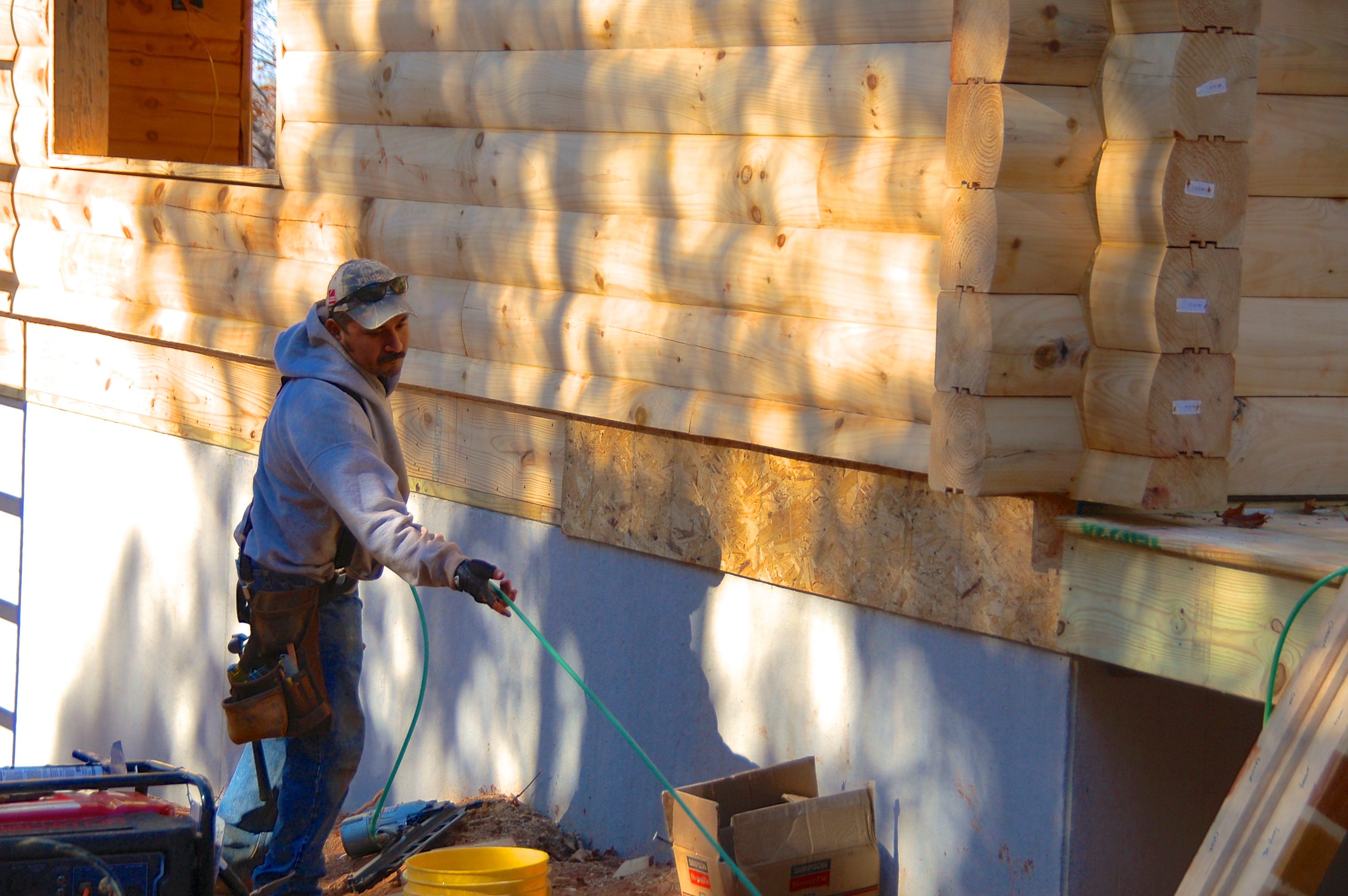 OSB is placed over the band board to prepare for log siding…low on OSB, the crew cleverly cut up and used the walls of the crate that the windows had arrived in