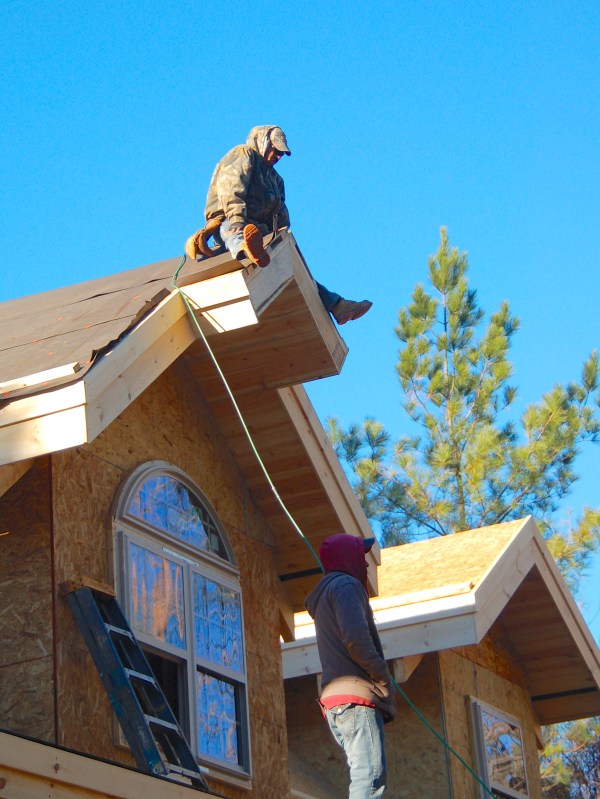 Carlos hanging out on the roof peak with Nelson just below, waiting for more boards