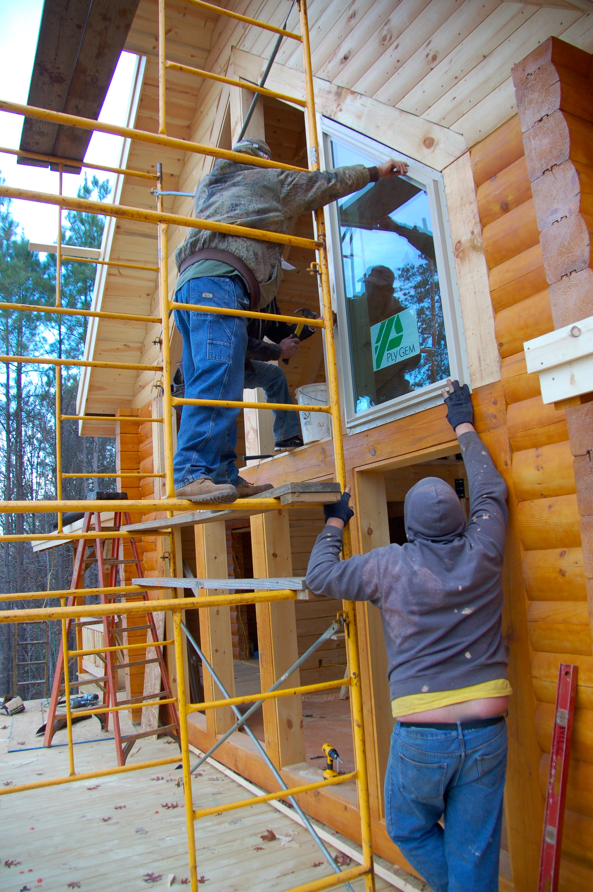 Mr. Lipham and Raymond hold the window while José secures it in place