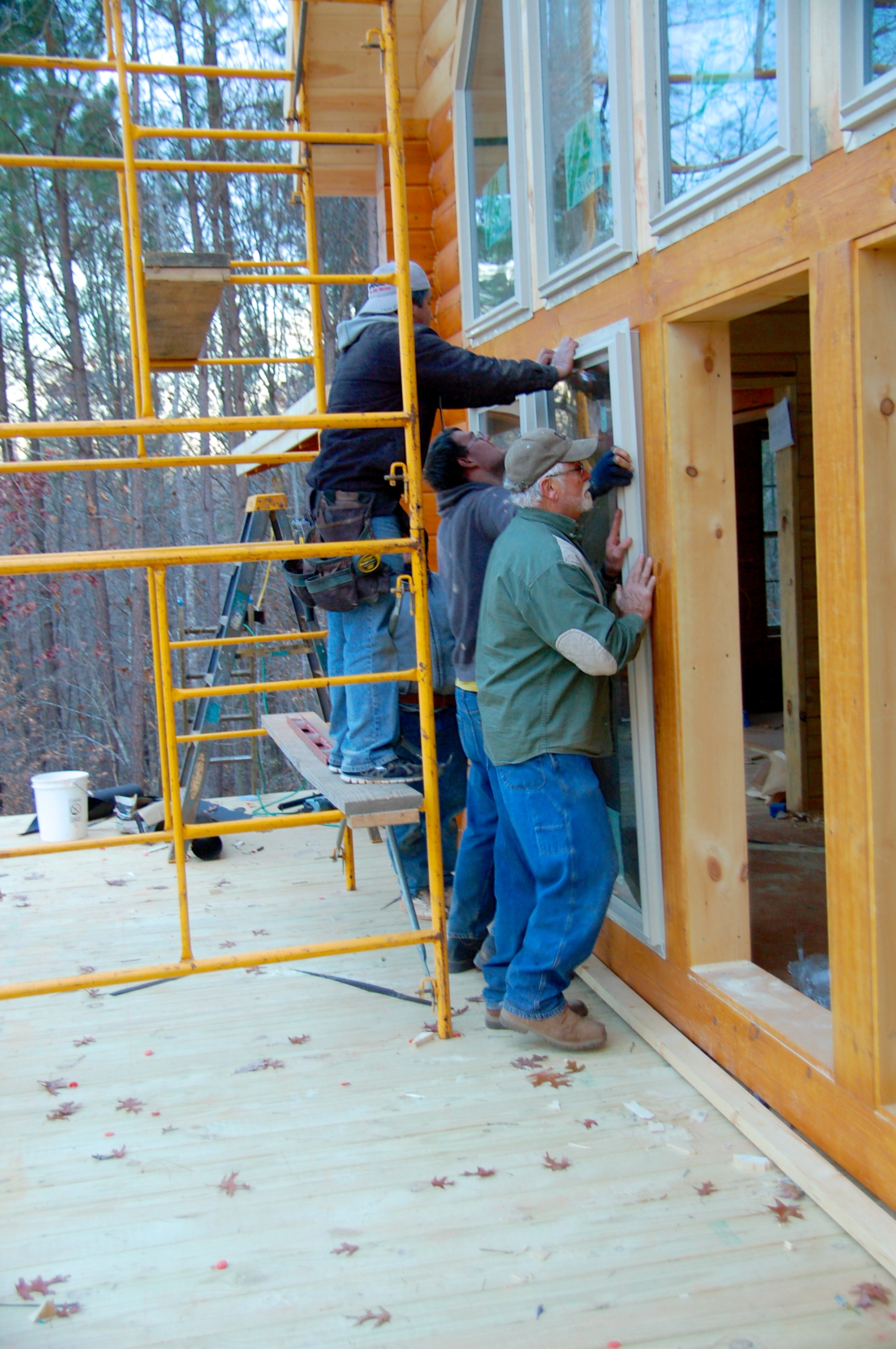 Mr. Lipham, Raymond, Miguel and José work the next window into place
