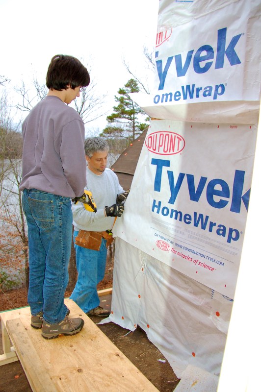 back down again, he helps Dave cover the chimney it Tyvek to keep the rain out