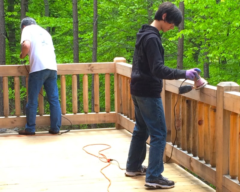 Dave and Max sanding away with the electric sanders (I was hand sanding the spindles)