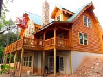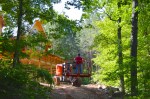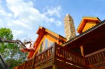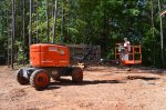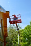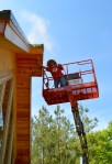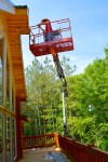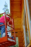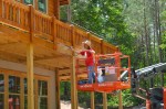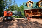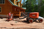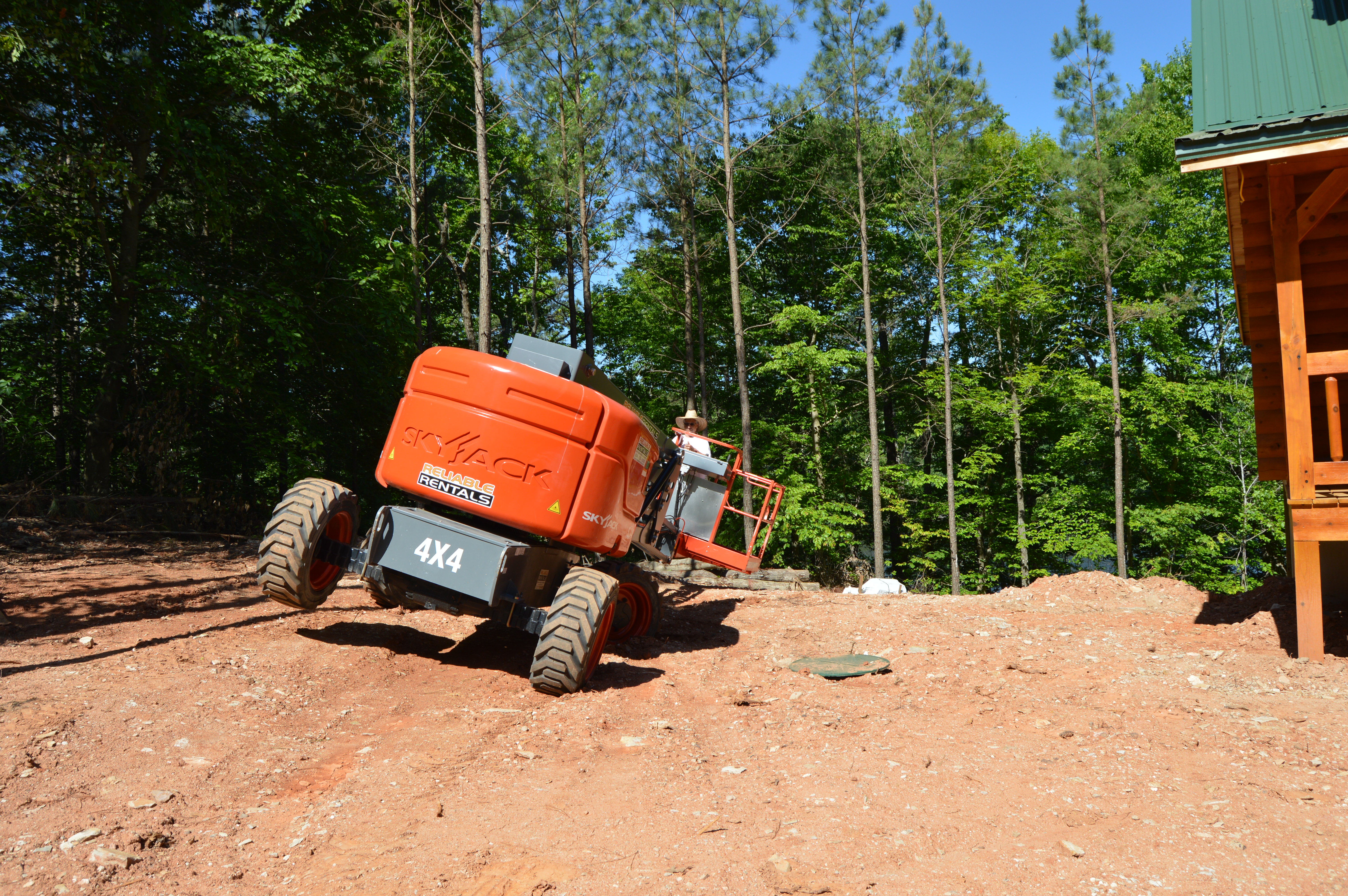 Outer first floor logs, dormers and deck rails all stained, we could no longer put off staining the upper portions of the cabin. After giving it much thought, Dave finally decided that the best way to tackle this daunting task was to rent a Skyjack lift with an articulating arm that would enable him to reach the higher areas of the cabin. We arranged for one to be delivered by Reliable Rentals in Dinwiddie over Memorial Day weekend and drove down early that Saturday to get started. Dave’s goal was to have the outside work done by the end of the weekend so that as the weather begins to get hotter, we can move our attentions to the inside. When we arrived Saturday morning, we found the lift had been delivered as promised and Dave went about trying to figure out how to use it. It all started out fairly well but, unfortunately, the day did not quite go as planned…