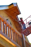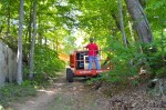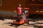 Because of the position of the septic tank, the Skyjack had to be driven farther out away from the house (so as not to crush the tanks), where the side of the property slopes downward. The newly regraded soil is still relatively soft here and as a result, as soon as the arm swung out far enough to reach the house, the right front wheel sunk into the loose dirt, throwing the vehicle off balance and left rear wheel began to raise off the ground, tipping the Skyjack to the right. (Ah-ha, that’s what all that extra beeping was about!) Once it’s off balance, Dave discovered, the wheels won’t move forward or backward and it took some effort to figure out how to rebalance the basket inorder to release the wheels so that he could drive it back up onto flat ground. After much frustration, Dave realized that there was no way he could get the vehicle base on a flat area close enough to the cabin that would enable him to lift the basket into a position that would allow him to stain that side of the cabin. Much discouraged, he gave up, thinking we’d just thrown $900 down the drain and would have to hire someone else to finish the staining after all.