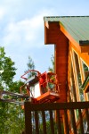 We returned Sunday morning, and, as Dave had reconsidered his decision to call someone else to finish the staining, he went ahead and gave the Skyjack another shot. I had suggested, the previous day, that he try driving it around to the other side of the cabin, via Colemans Lake Rd, and up the old road where the ground would be harder and more level. Apparently he had mulled the idea over the evening before and decided to give it a try.
