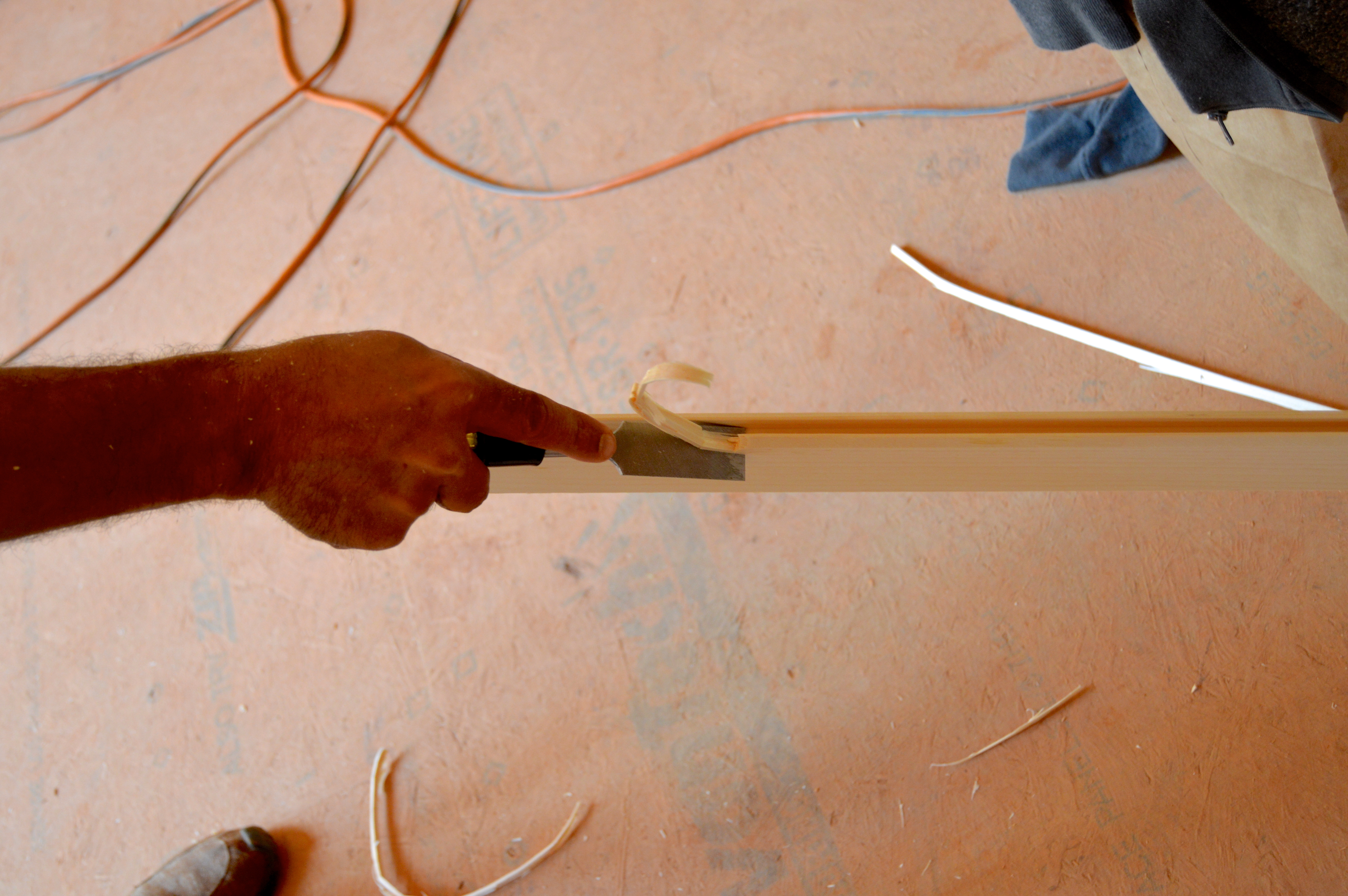 Dave uses a chisel to remove the upper grooves so the narrow board will slip in place