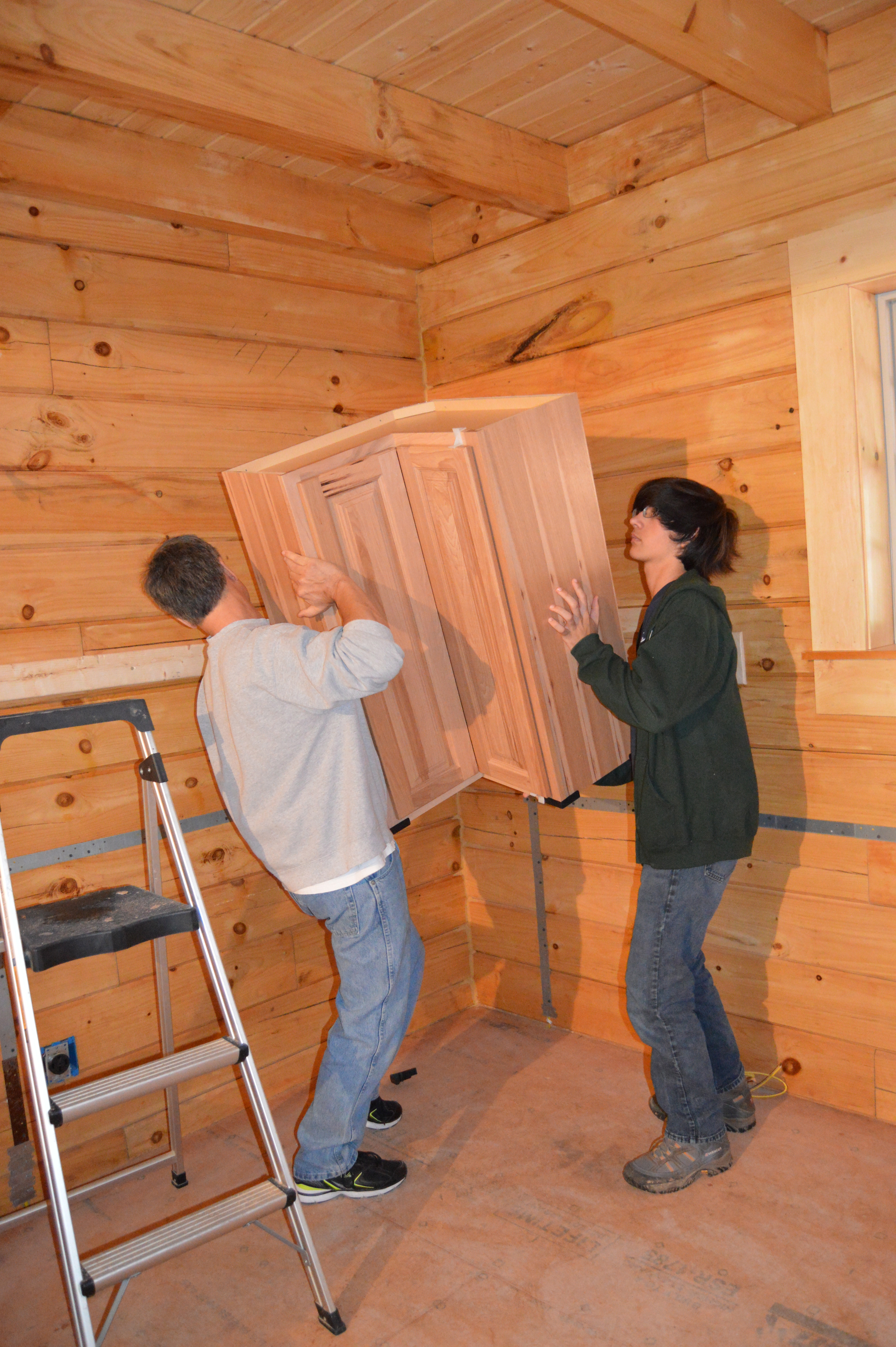 Dave and Max lift the first cabinet..Max then holds it in place and Dave attaches it to the wall