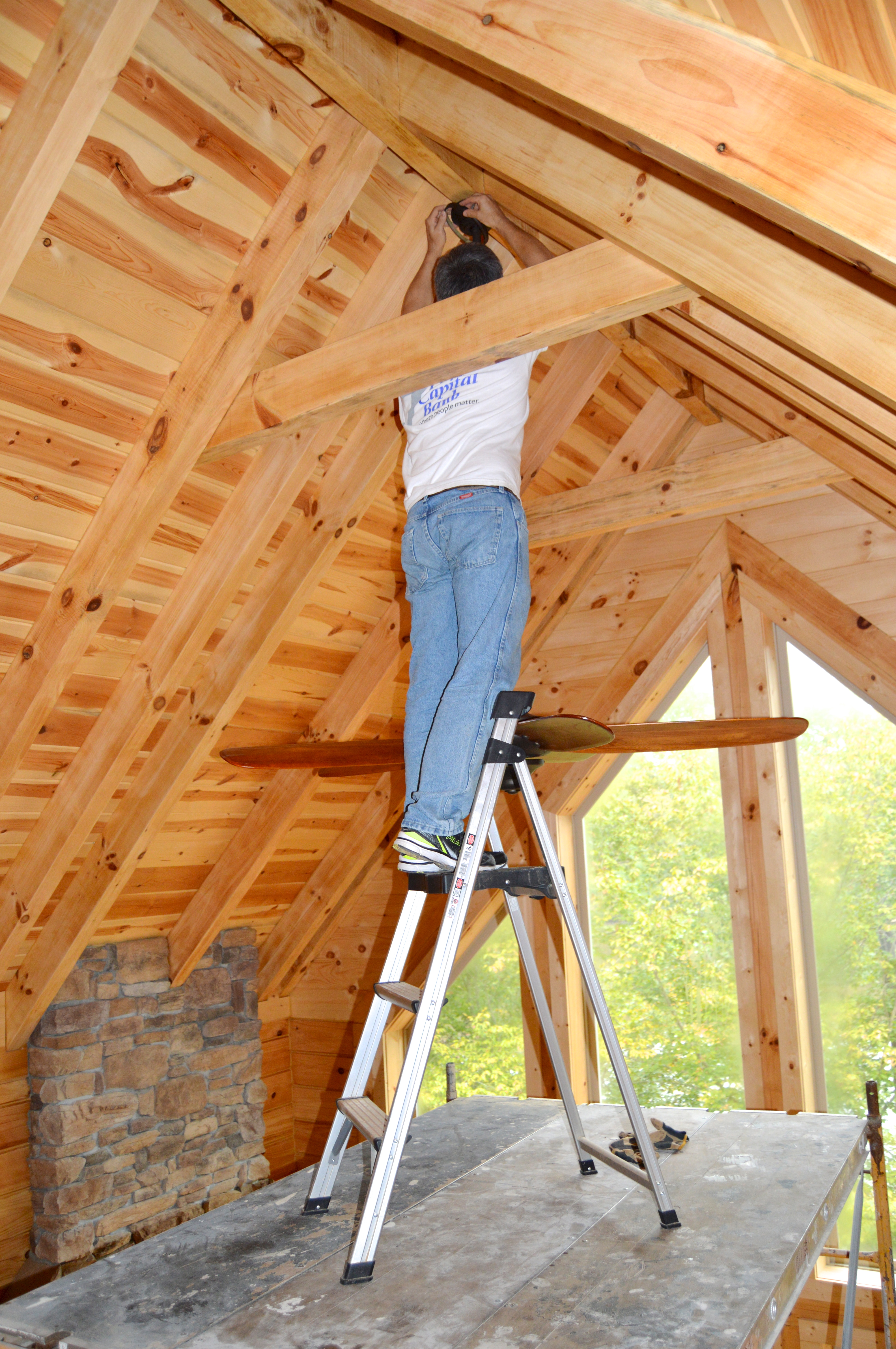after taking down the upper level of scaffolding, Dave realizes he still needs to attach one more piece…no worries, a ladder will do the trick