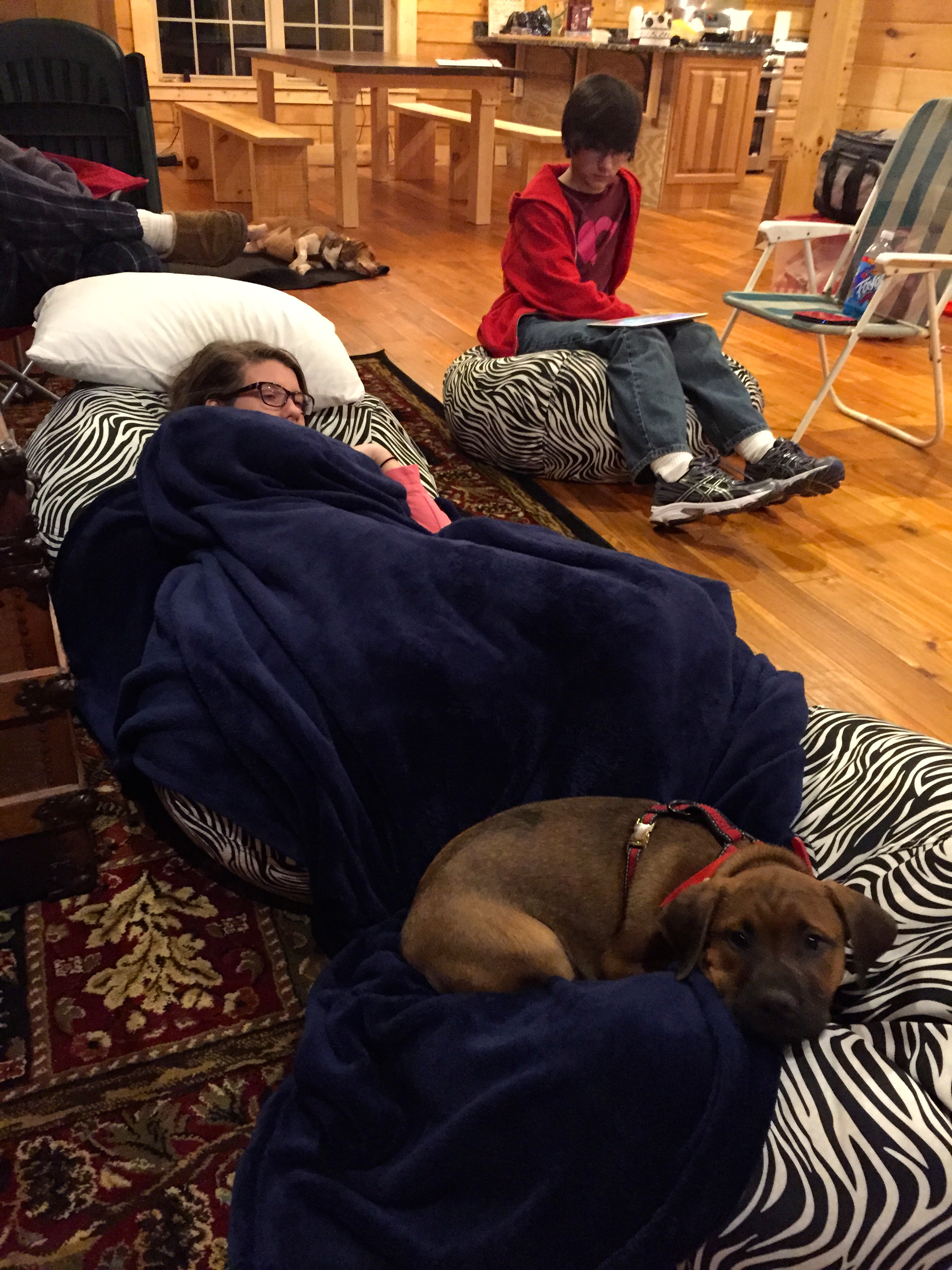Emily and Mituna make a cozy nest with the bean bag chairs