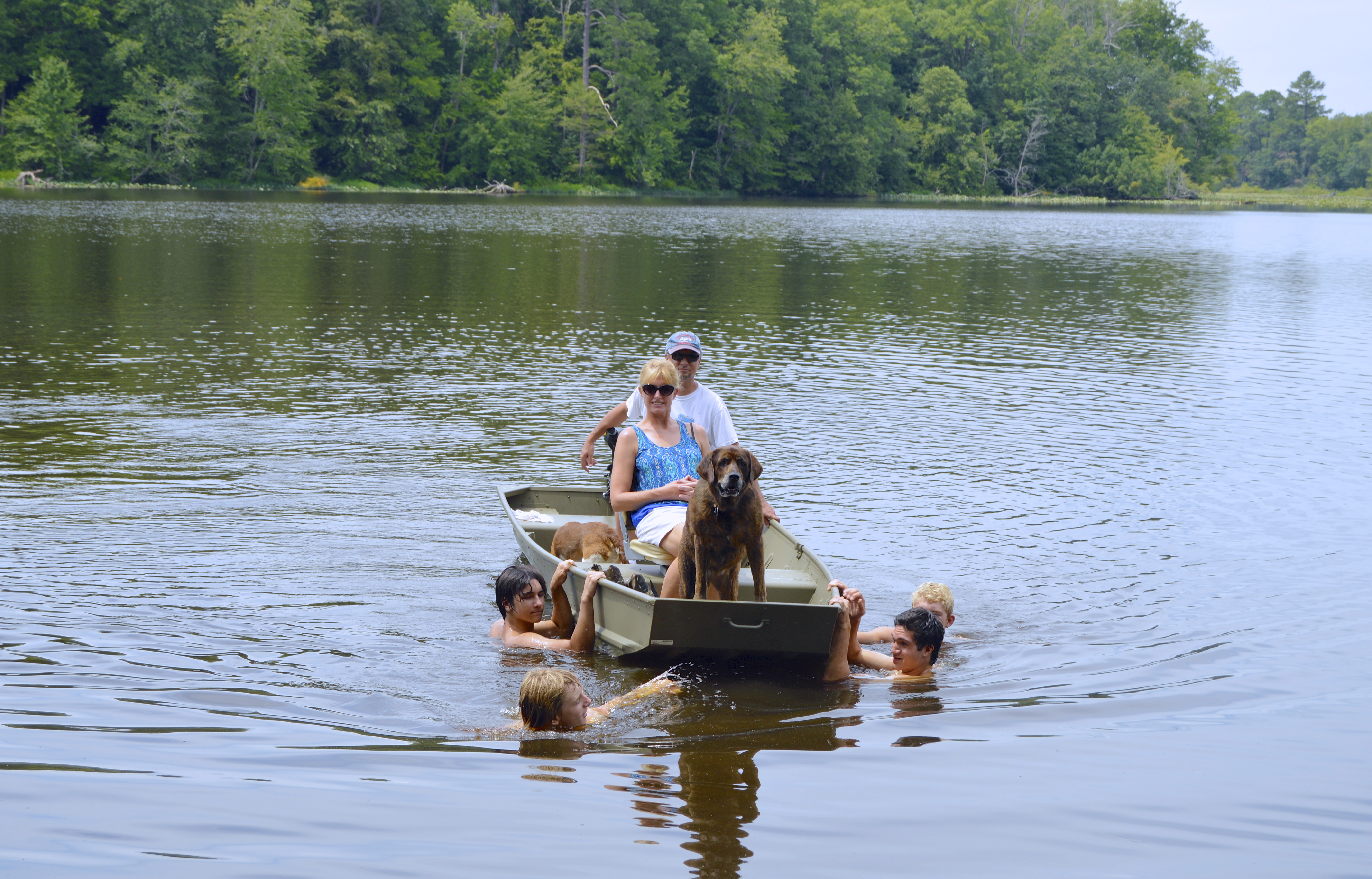 the boys decided to swim to the otherside of the lake, not realizing how far it actually is…Dave, Megan and Waffles take the boat out to rescue them 🙂