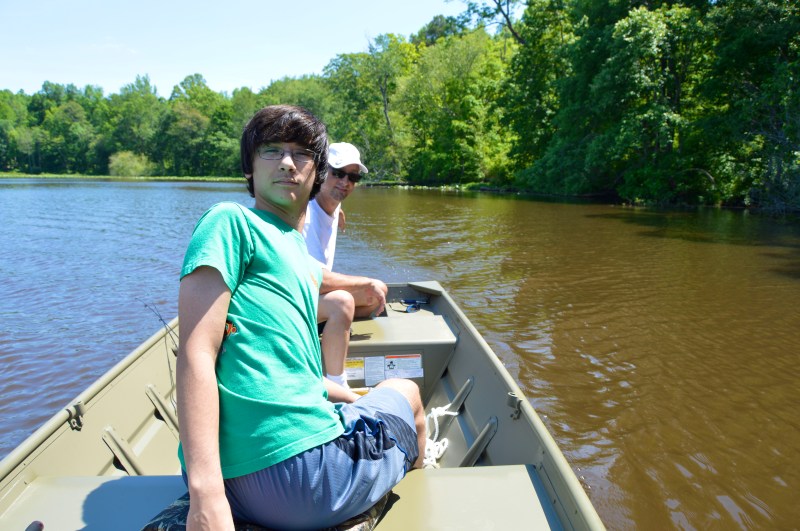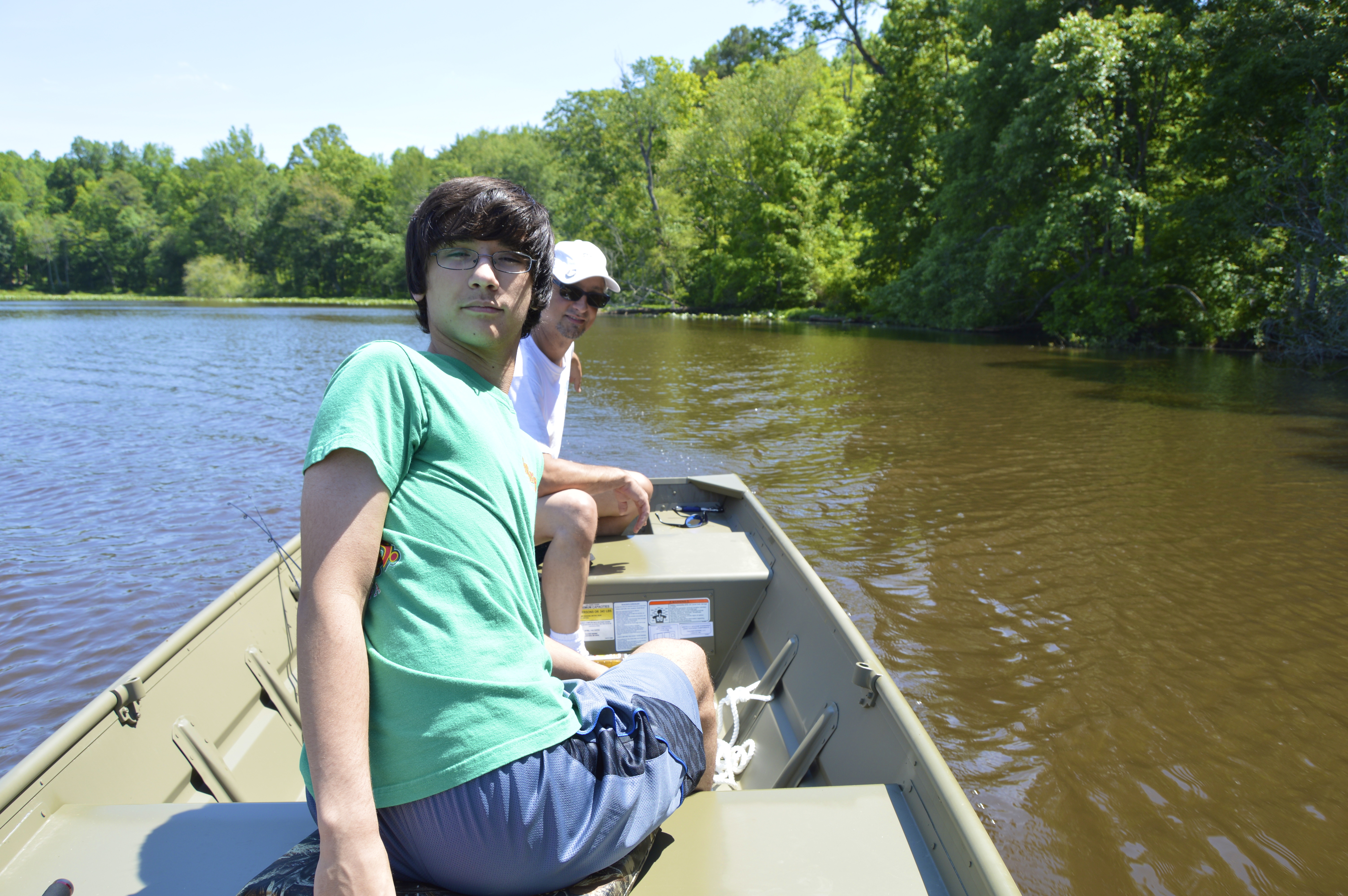 Max and Dave take a spin around the lake in our new fishing boat