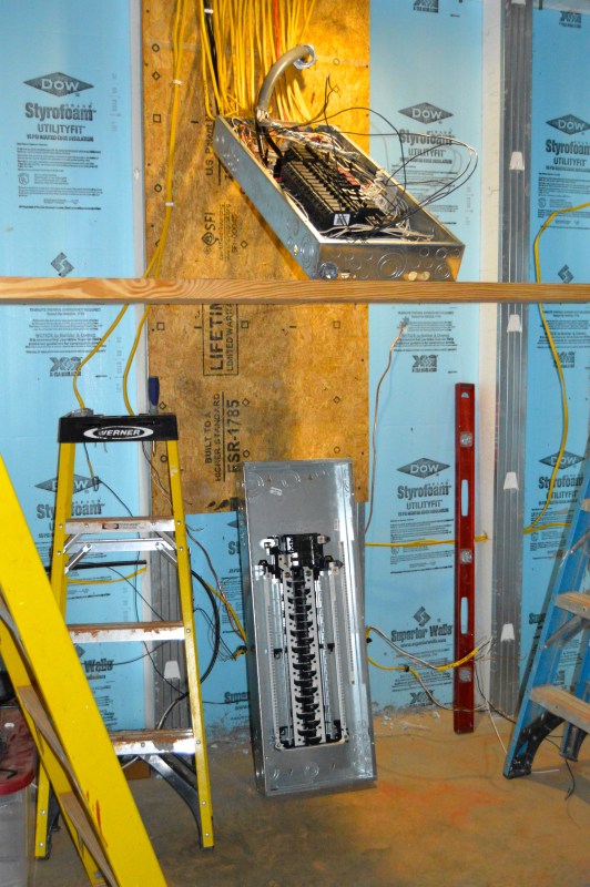 the larger panel box rests on the floor waiting to be installed