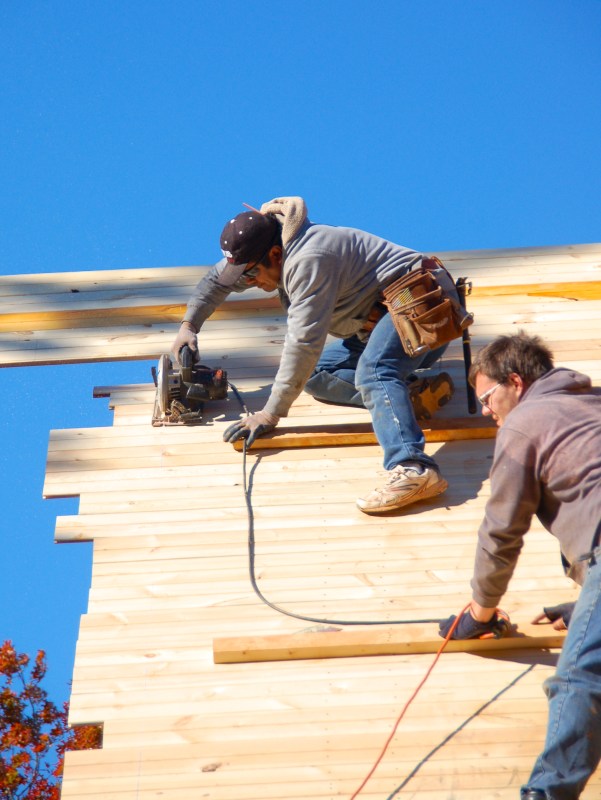 the the t & g of the front roof in place, Miguel and Raymond even off the side edge