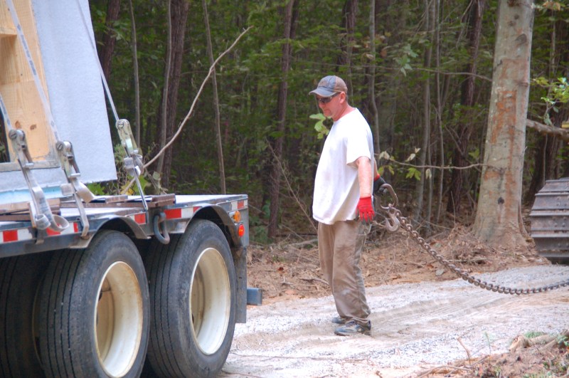 one of the crew pulls the tow chain from the bulldozer to hook up to the truck