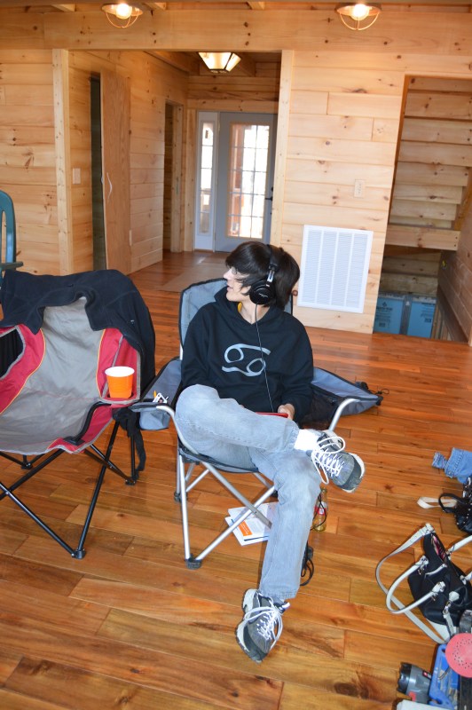 Max in his usual place in front of the fire with laptop and headphones