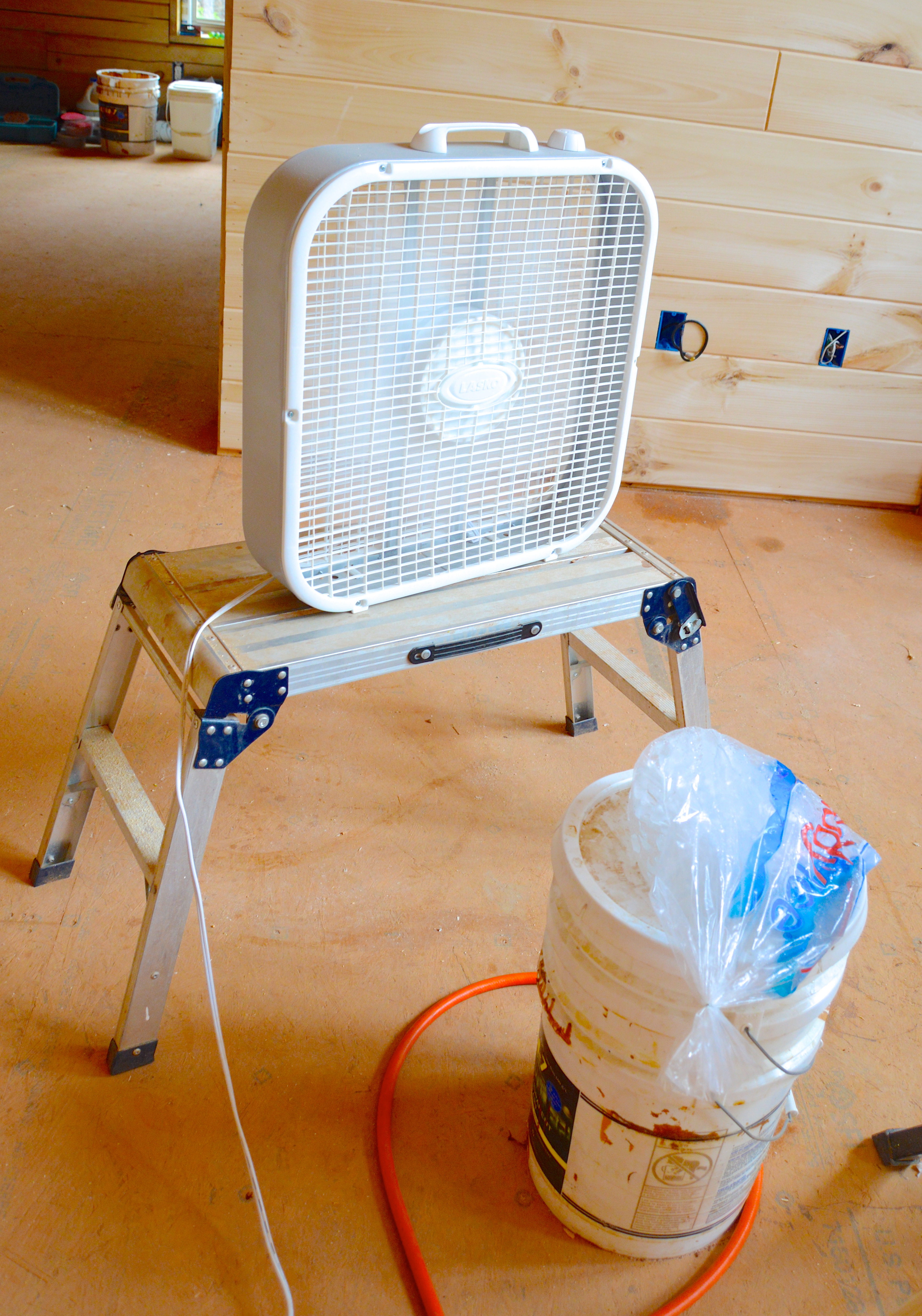 first order of business… it’s hot and humid in here so we throw together a make-shift air conditioner with a bag of ice and a fan