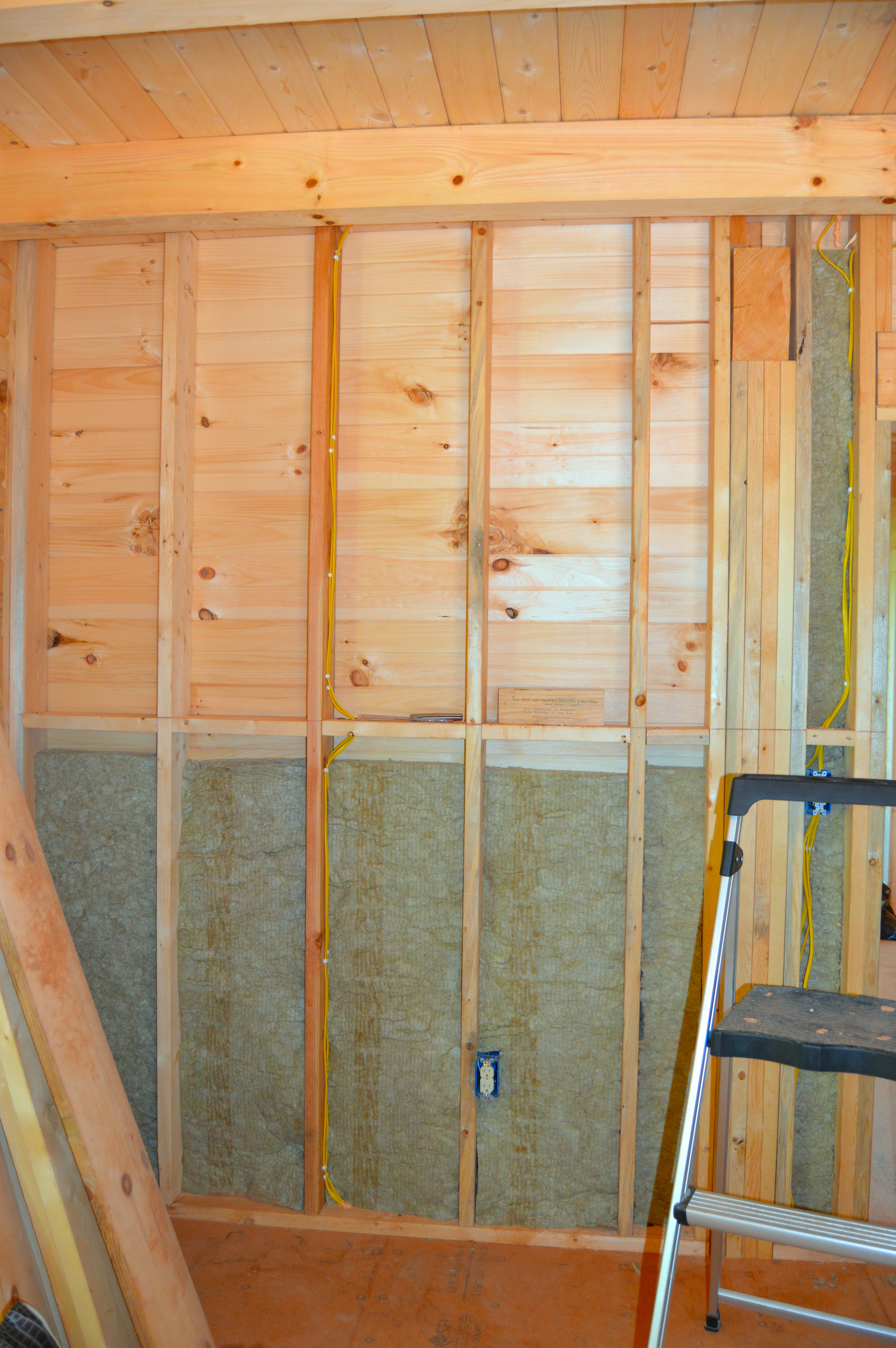Safe and Sound insulation goes in between the studs before we put up the tongue and groove