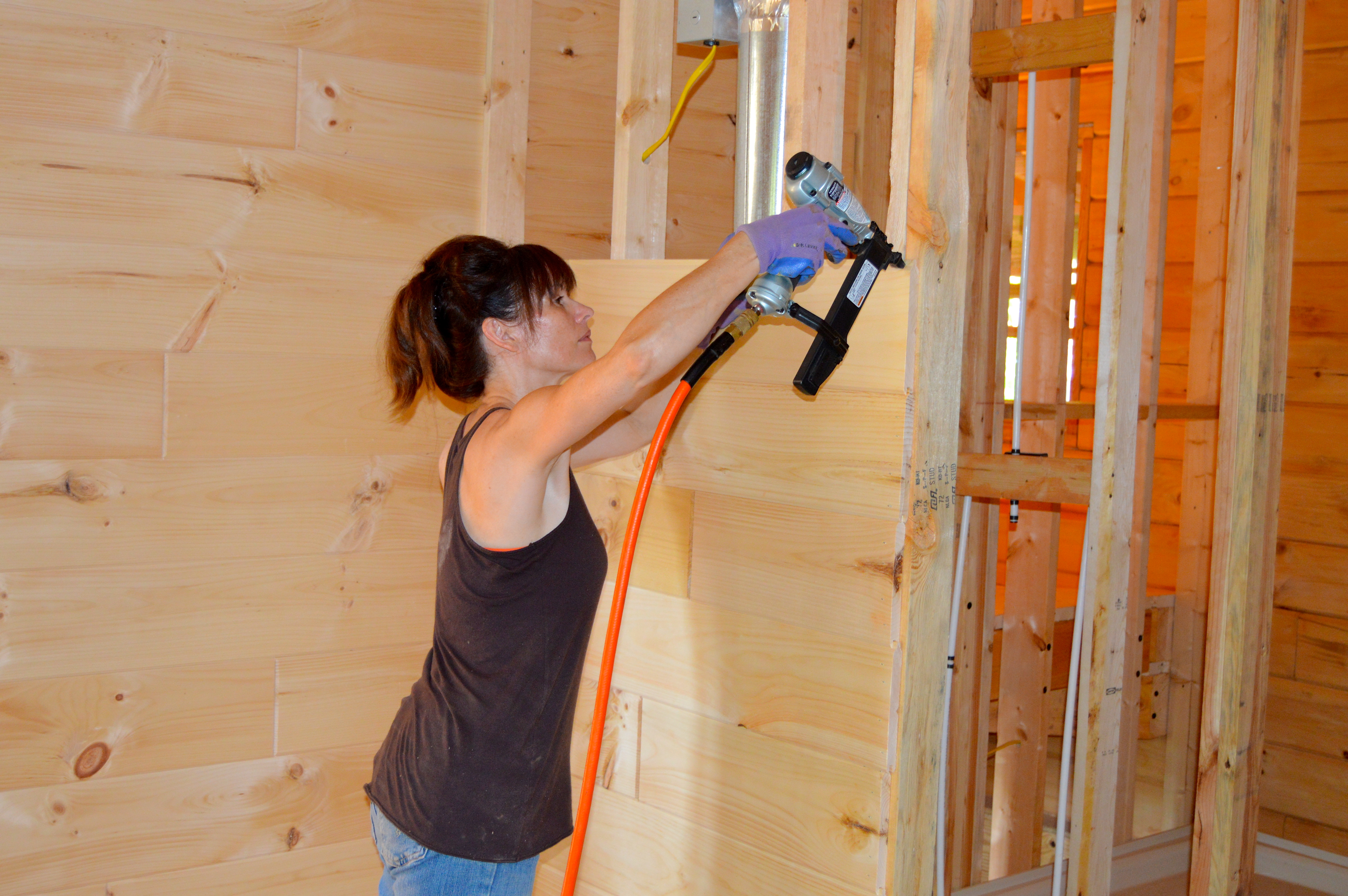 working my way up the wall between the bedroom and master bathroom, I use the staple gun to attach the t&g to the studs