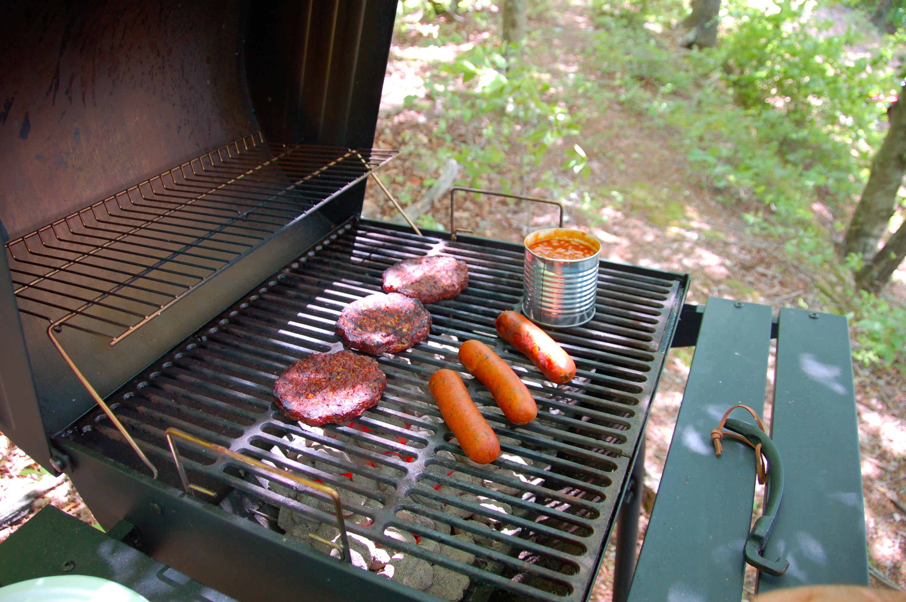lunch – black bean burgers, roasted red pepper and spinach brats with a side of baked beans