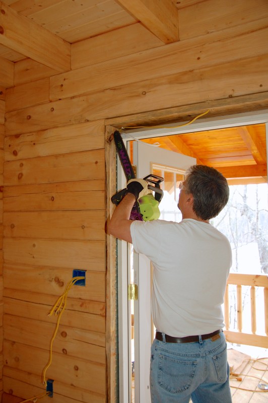 Dave uses the chainsaw to cut a space into the door frame for the new wire