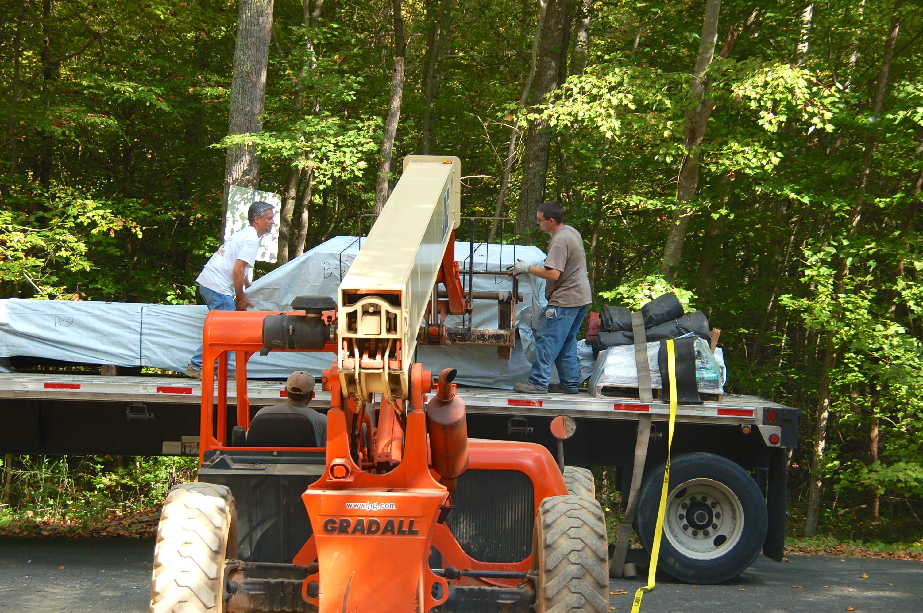 Dave helps the third bus driver, Dustin (whose last name is also King), load one of the pallets onto the fork-lift