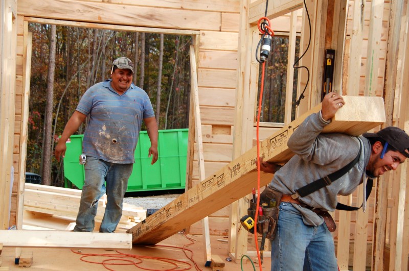 jokes log craftsmen play on one another- drop one end of the heavy timber leaving your buddy to carry the entire thing