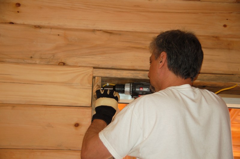 drilling into the master bedroom doorframe to run the wires from the outside
