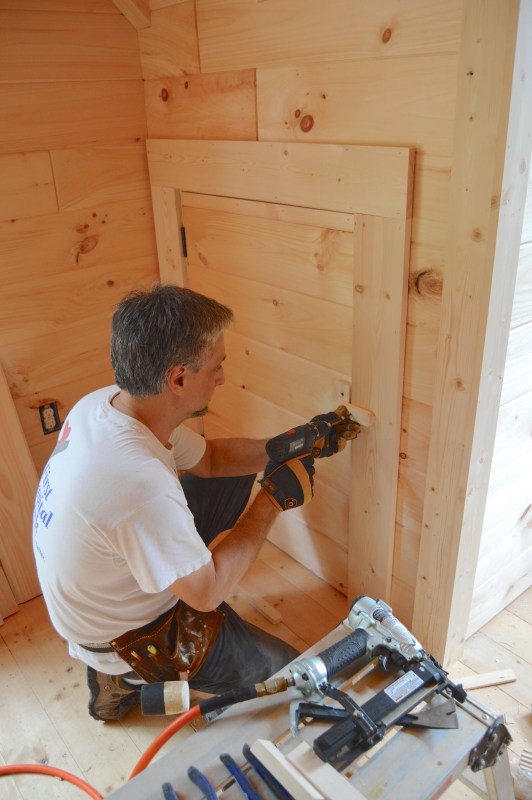 he then attaches the second piece horizontally on the door frame