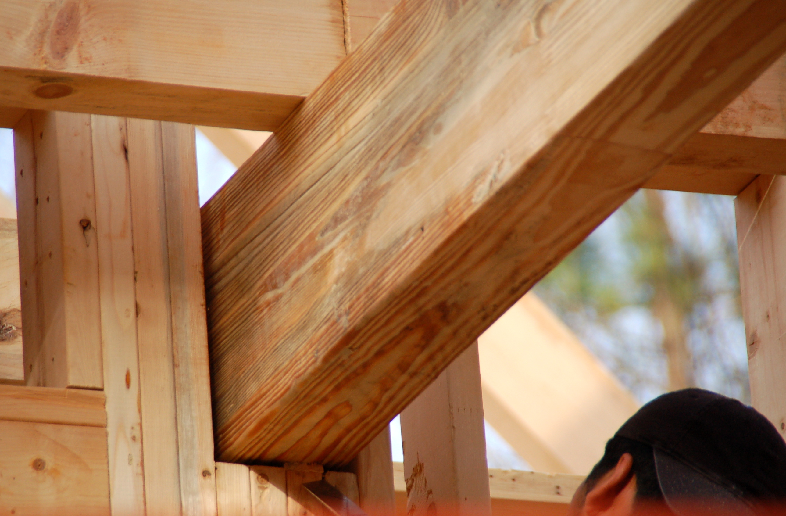 the lamibeams, though stronger than the solid timber, are slightly smaller so shims were placed to fill the gap