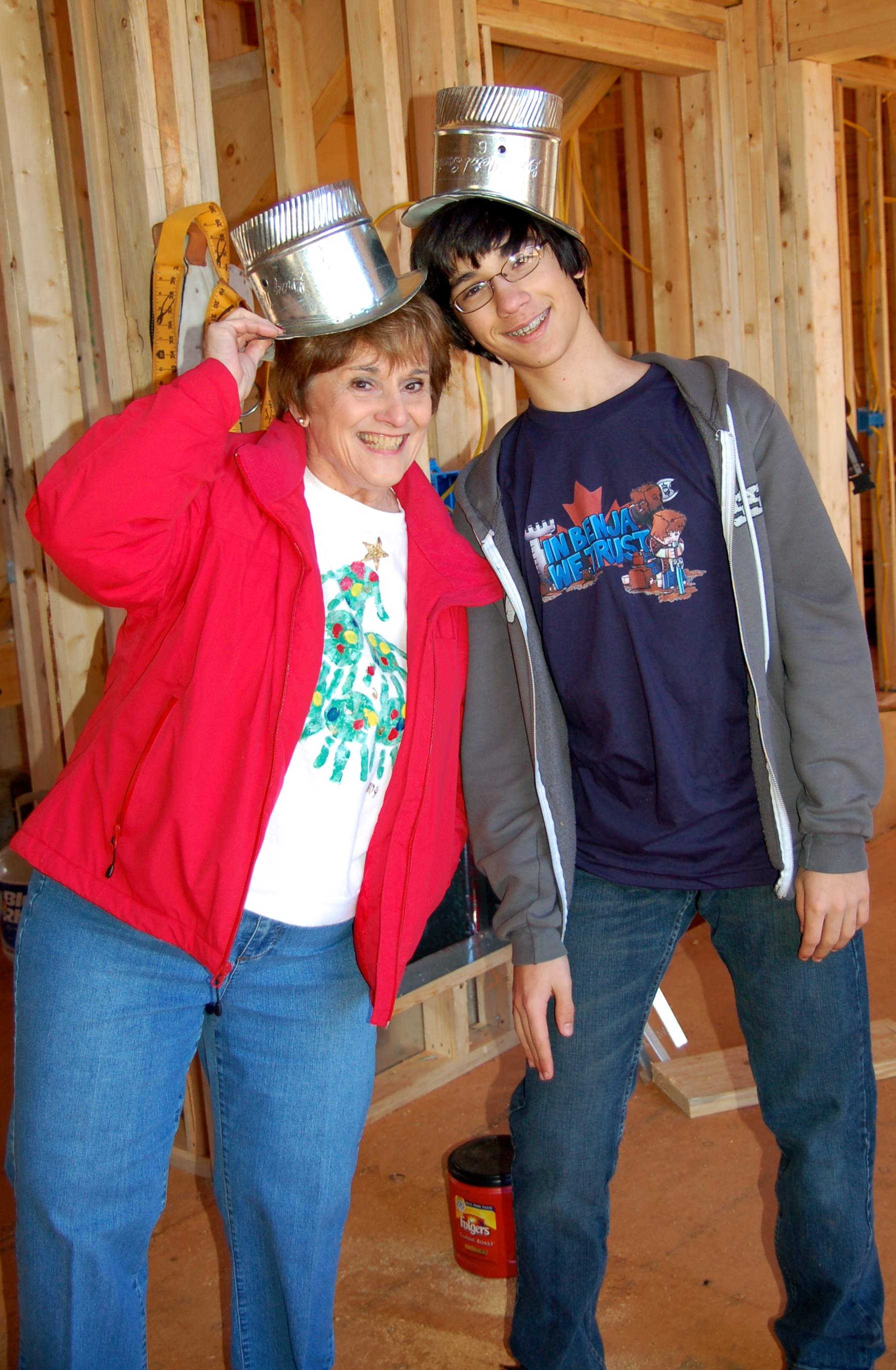 Max and Grammy goofing around with HVAC scraps…hey, they looked like top hats to me! too