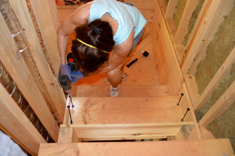 as we place the t&g along the wall, I reattach the newly shortened steps