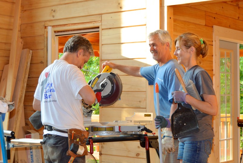 Lynne and Brian watch as Dave cuts the FINAL piece of t & g