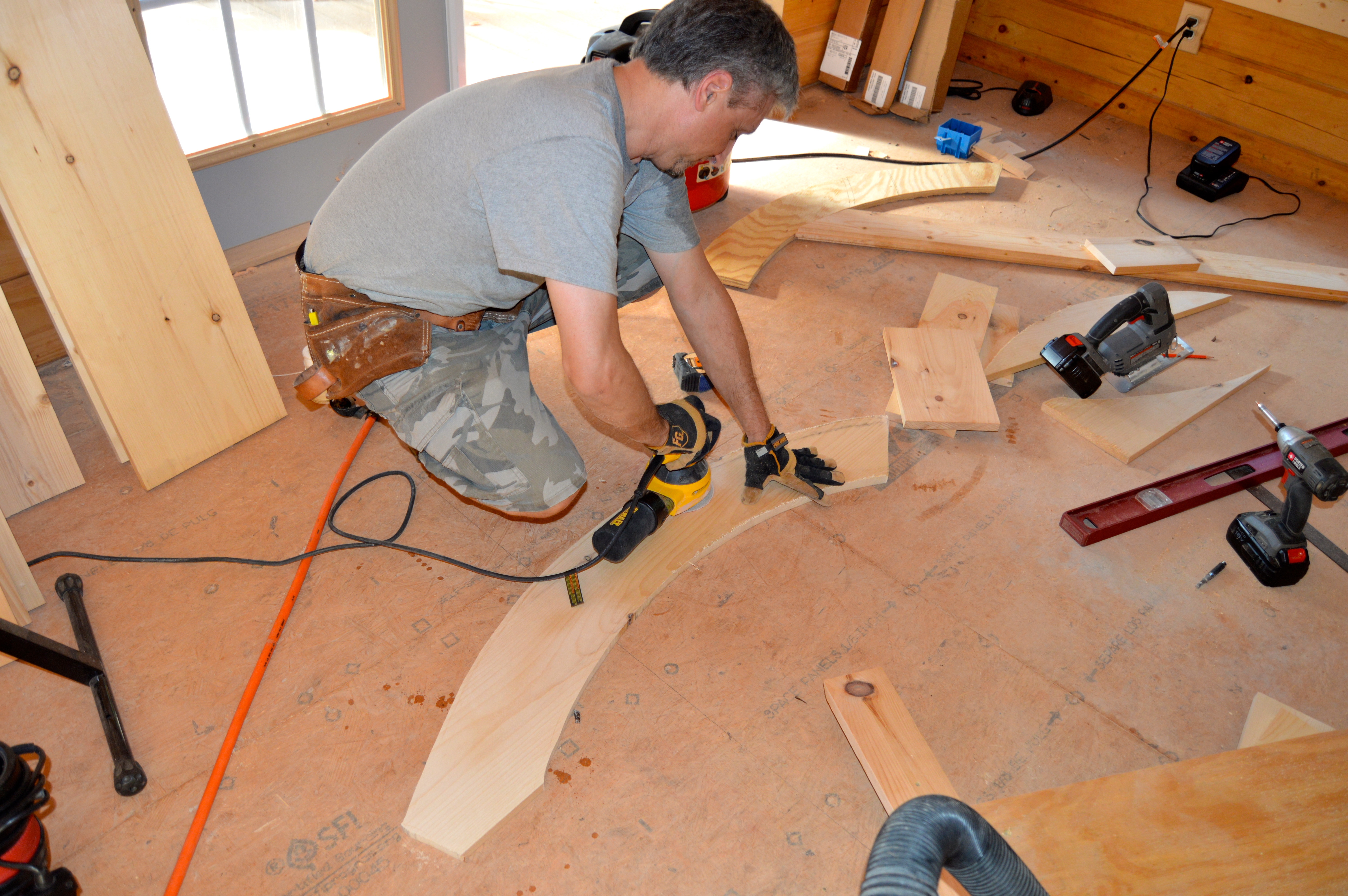 using the plywood template as a guide, Dave cuts and then sands two mirror pieces from a 1″ x 12″ board…the finished arch will be formed from these two pieces, along with a keystone center to cover the seam