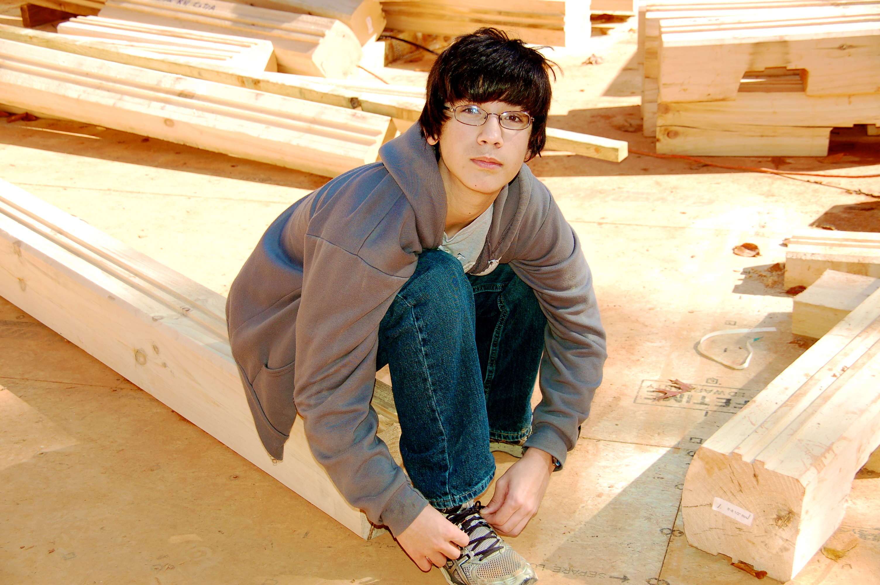 Max kneels down amongst the scattering of logs to tie his shoe