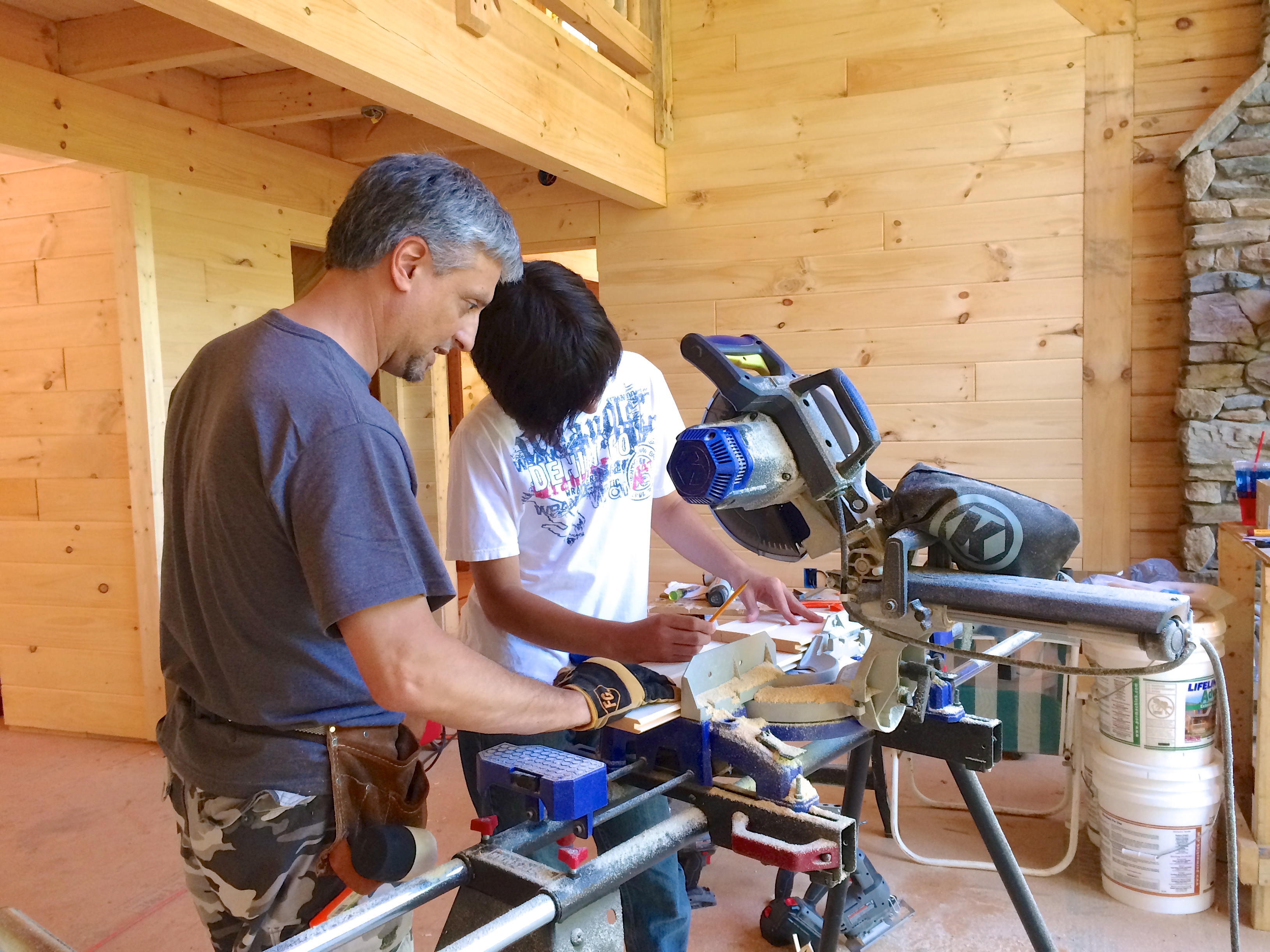 next lesson, Dave teaches Max how to measure and cut out a hole in the tongue & groove for the wall outlet