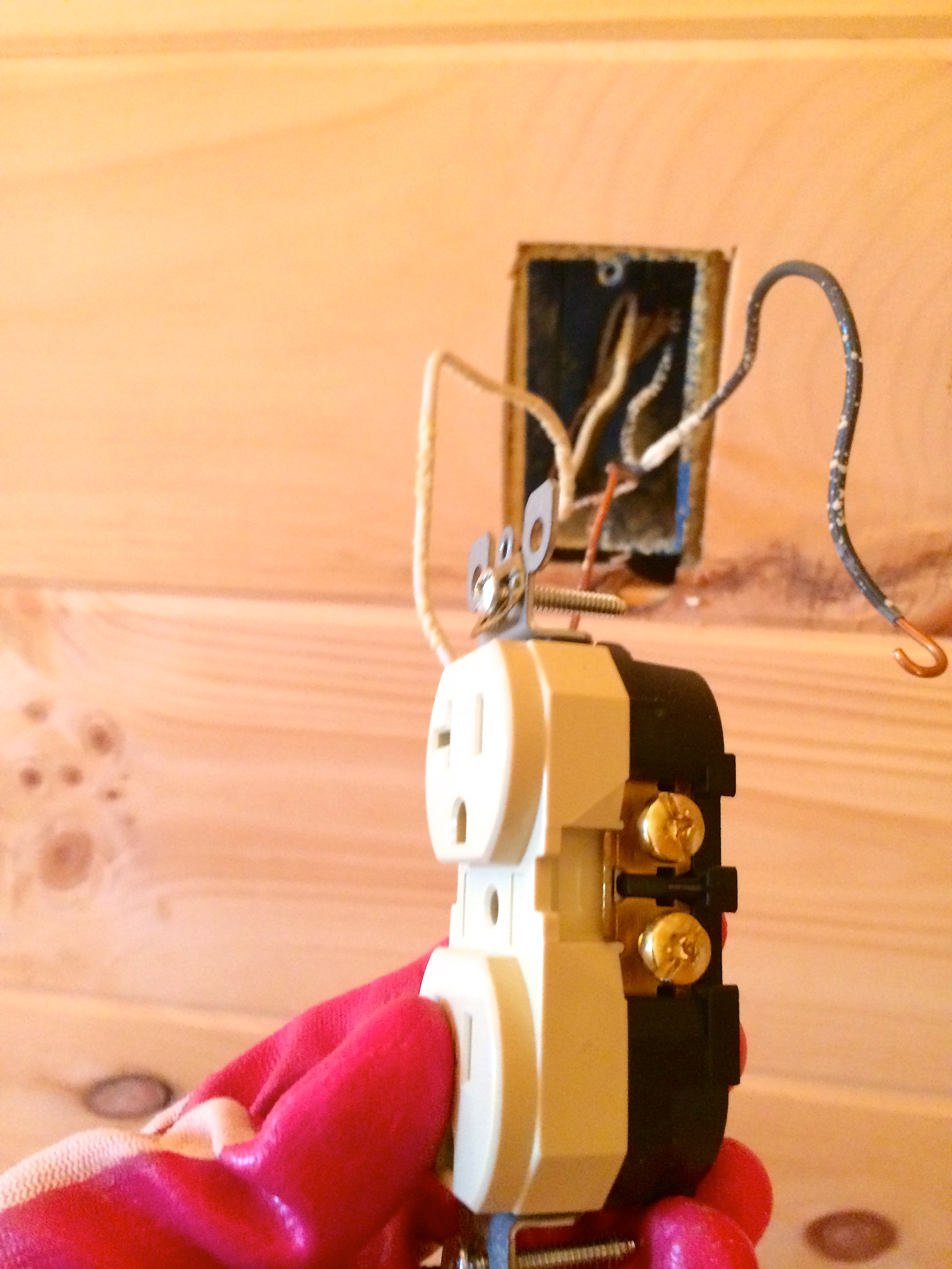 I start with the black wire, which always attaches to the gold screw- if you have two black, you use both screws, but since there is only one here, I just use the top screw