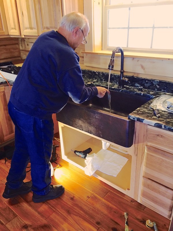 installing the faucet ended up being a bit more difficult than anticipated, due to the extra support structure Dave had built for the sink, but he and Frank were able to get it installed and working a few days later